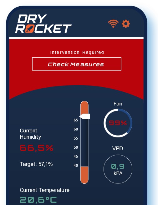 Sollte doch mal eine Unregelmäßigkeit auftreten, wird diese schnell erkannt. DryRocket meldet sich dann über die App und zeigt dir den Handlungsbedarf. Läuft zum Beispiel ein Lüfter dauerhaft auf voller Leistung, ist das ein Hinweis auf ein gesättigtes RocketFuel. Die App begleitet dich dann Schritt für Schritt mit einer Checkliste, um den Fehler zu finden und zu beheben.