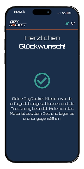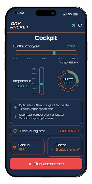 Auch bei einem kurzzeitigen Verlust der WLAN-Verbindung arbeitet die DryRocket zuverlässig und autonom weiter. Der Trocknungsprozess wird nicht unterbrochen und läuft wie vorgesehen weiter.  Während die Verbindung getrennt ist, können jedoch keine Push-Benachrichtigungen an dein Smartphone gesendet werden. Sobald die Verbindung wiederhergestellt ist, funktioniert auch die App-Kommunikation wieder wie gewohnt. Bitte prüfe in diesem Fall deinen Router, deinen Internetanbieter oder ob das WLAN-Signal am Standort der DryRocket ausreichend stark ist.